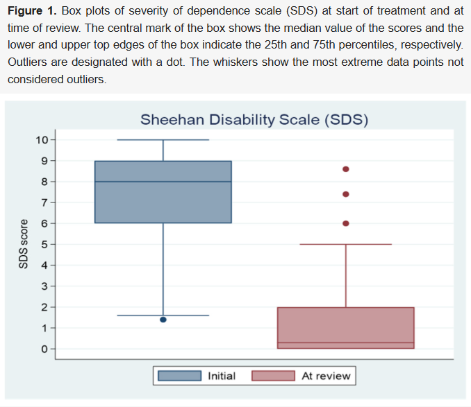 Figure 1 show the changes of SDS from start of treatment to at time of review. The SDS score was reduced in 55 patients from 7.33 (median: 8; range: 1.4–10) at the start of treatment to 1.27 (median: 0.3; range: 0–8.6) at the time of review, which was significant (mean change 6.06 (95% C.I. 5.36 to 6.77), Cohen’s d = 2.61 (95% C.I. 1.81 to 2.83), t(54) = 17.23, p < 0.001). While no patient scored 0 initially, eighteen patients (32.7%) scored 0 at review; 48 patients scored above the clinical cutoff 5 initially, with only 3 scoring above 5 at review.