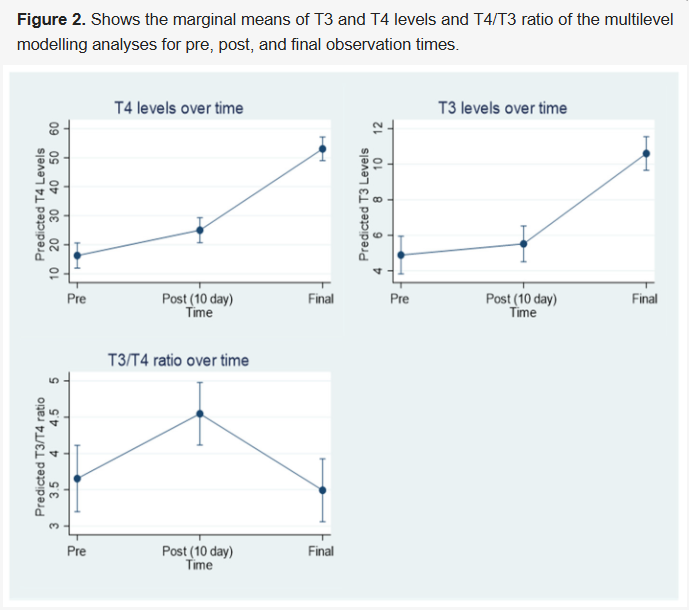 Figure 2 shows the changes of T3, T4, and T4/T3 levels over time. Mixed-model analyses showed that mean T3 levels slightly but non-significantly increased from 4.9 (median 4.60, range: 2.1–12.4) at treatment start to 5.5 (median: 5.4, range: 3.2–8.9) at day 10 of treatment (p = 0.38), and increased significantly to 10.6 (median: 8.8, range: 3.7–29.0) at the review time point (p < 0.001). Mean T4 levels increased significantly from 16.3 (median:16.2, range: 6.0–26.7) at treatment start to 25.0 (median: 25.4, range 4.7–36.0) at day 10 treatment (p = 0.005) and increased significantly to 53.0 (median: 50.4, range: 17.2–100.0) at the review time (p < 0.001). The changes in T3 and T4 levels resulted in a significant increase in T4/T3 ratio from 3.7 (median: 3.5, range: 0.5–8.8) at treatment start to 4.5 (median: 4.8, range: 1.0–6.0) at day 10 of treatment (p = 0.005) and a reduction to 3.5 (median: 3.3, range: 0.9–12.7) at the review time point (p = 0.001), reaching a similar ratio as at baseline (p = 0.62).