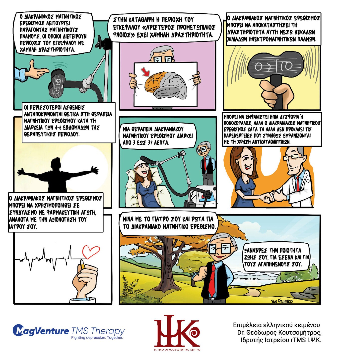 Στην ερώτηση «τι διαφοροποιεί το ΙΨΚ», η απάντηση είναι η διεπιστημονική του ομάδα, η υψηλού επιπέδου εκπαίδευση ειδικών και η πρωτοποριακή χρήση της εξειδικευμένης θεραπείας με επαναληπτικό Διακρανιακό Μαγνητικό Ερεθισμό (rTMS), όπως εξηγεί ο δρ. Κουτσομήτρος, που έχει εξειδικευθεί σε αυτήν τη θεραπεία στα πανεπιστήμια του Mάαστριχτ και του Χάρβαρντ. Πρόκειται για μια ανώδυνη, μη επεμβατική ιατρική θεραπεία, εγκεκριμένη από τον Οργανισμό Τροφίμων και Φαρμάκων (FDA) των ΗΠΑ και την Ευρωπαϊκή Ένωση (CE), που λειτουργεί διεγείροντας περιοχές του εγκεφάλου με χαμηλή δραστηριότητα. Η θεραπεία rTMS, λοιπόν, μπορεί να αποκαταστήσει τη δραστηριότητα αυτή μέσω δεκάδων χιλιάδων ηλεκτρομαγνητικών παλμών. Χωρίς αναισθησία, ανώδυνα, σε συνεδρίες που διαρκούν από 3 έως 37 λεπτά, χωρίς σοβαρές ή καθόλου παρενέργειες και, όταν χρειάζεται, συνδυαστικά με φαρμακευτική αγωγή ή και ψυχοθεραπεία. Ανάλογα με την πάθηση, η θεραπεία μπορεί να διαρκέσει από 1 έως 6 εβδομάδες.