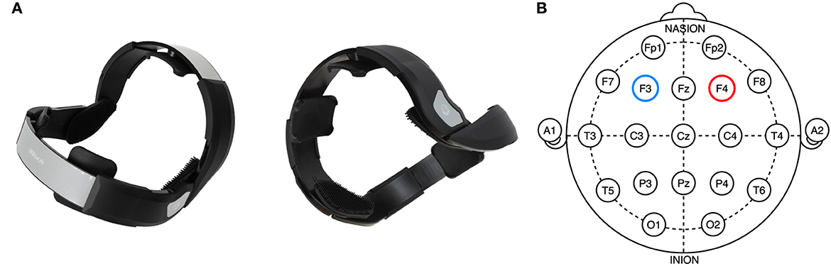 The PlatoWork tDCS headset is a fixed-montage clinical headset designed for home-administered use and does not require manual electrode measurement or fixation, as shown in Figure 1. The mechanical geometry of the headset mirrors the International 10-20 EEG System by following its angles and logic. This defines the fixed location of the three remotely-programmable electrodes that are integrated into the frame at the F3, F4 and Pz positions on the scalp. For our study, only two electrodes located at F3 and F4 were active, and the Pz electrode was disabled, as it is used only in alternative montages. The size of the headset scales to fit a variety of head sizes, with the relative positioning of electrodes remaining the same within and between patients, with the aim of providing consistent and reliable results across multiple sessions.