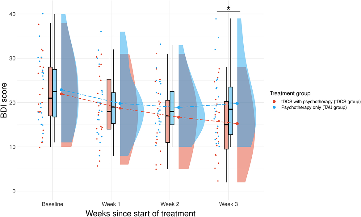 Figure 2. Change in BDI score comparing the score at baseline to the 3-week therapy. This interaction between the treatment group and the change in BDI score over time was significant, t(118) = 2.181, p = 0.031. Pairwise comparisons showed a significant decrease in BDI score when comparing the two groups at the 3 week timepoint [t(35) = 3.255, p = 0.038]. *Significant (p <0.05) difference. NB. TAU, treatment as usual; tDCS, transcranial direct current stimulation.