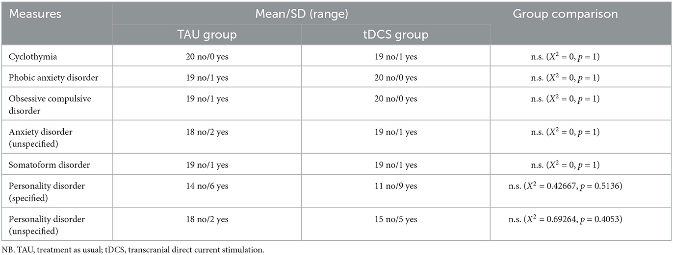 Practical feasibility was defined as the extent of patients’ compliance with the stimulation protocol. Of the 20 patients in the tDCS group, 90% demonstrated good compliance and did not miss more than three of their assigned 21 sessions, while half of the group completed all sessions with full 100% compliance. One patient confirmed having missed three sessions due to a COVID-19 infection. There was no attrition in the tDCS group but three (15%) of the TAU group patients dropped out due to their inability to comply with either the inclusion and/or exclusion criteria. They were replaced with three newly recruited participants to maintain two equal groups of 20 patients. Additionally, 100% of tDCS sessions were within the acceptable range of <20 kΩ impedance.