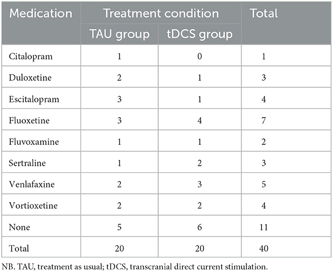 Of the 20 patients in the TAU group, five patients were not taking any antidepressants with the remaining 15 taking either serotonin-norepinephrine reuptake inhibitors (SNRIs; Duloxetine or Venlfaxaine) or selective serotonin reuptake inhibitors (SSRIs; Citalopram, Escitalopram, Fluoxetine, Fluvoxamine, Sertraline or Vortioxetine), as shown in Table 3. In the tDCS group, six out of the 20 patients were not taking any antidepressants, with the remaining 14 taking either SNRIs or SSRIs.