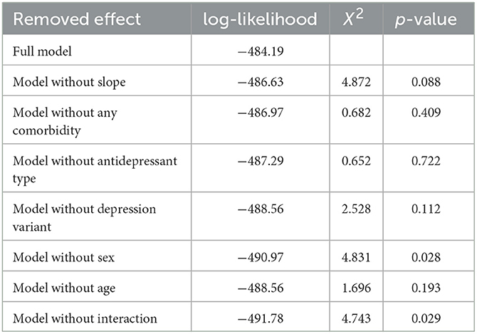 We used a backwards procedure to select the most parsimonious model that was not a significantly worse fit for the data, starting with the most complex model which included all the factors listed above as fixed factors with the addition of the interaction term to capture the hypothesized improvement in depression scores over time in both groups, as well as the random factor of patient to account for individual variation and a random slope of time assuming that each patient responded at a different rate. Using a Likelihood Ratio (LR) test, we selected the best fitting model. Since it included a significant interaction term, we conducted post-hoc Bonferroni-corrected pairwise comparisons to investigate at what time point the difference in depression levels between the two groups became significant.